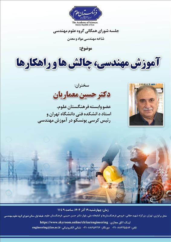سخنرانی دکتر حسین معماریان در جلسه شورای همگانی گروه علوم مهندسی شاخه مهندسی مواد و معدن، با عنوان «آموزش مهندسی، چالشها و راهکارها»؛ روز چهارشنبه 19 آذر 1404، ساعت 9 تا 11 برگزار خواهد شد.